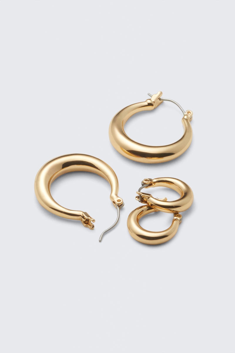 A two-pack of polished hoop earrings in silver-toned metal, crafted in a smooth, rounded shape with a clean, minimal clasp fastening. Comes with two sizes for versatile styling – one measuring approx. 2.5 cm and the other 4 cm in diameter. Designed with a high-shine finish for a sleek, understated look that works solo or stacked. Ideal for day-to-night wear.