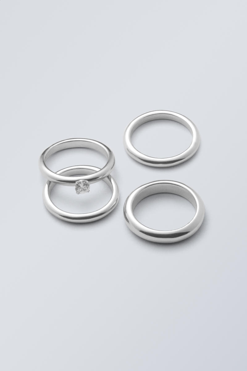 Ett 4-pack med olika ringar tillverkade av återvunnen zink. Förpackningen innehåller tre släta ringar och en prydd med en diamantformad sten.