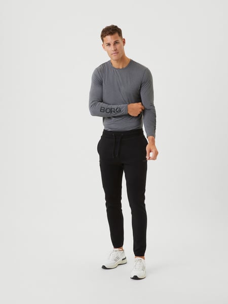 Kvaliteten i dubbel jersey av ekologisk bomull och återvunnen polyester är mjuk och bekväm. Passformen är lite smalare än traditionella sweatpants. Träningsbyxor, joggingbyxor eller snyggt avslappnade byxor hemma, de passar alltid in. Sweatpants för herr med sidofickor och ficka på benet med dragkedja. Midja med både dragsnöre och resår för en perfekt passform och skönt stöd. De ribbade muddarna i ben och midja är en lika bekväm som snygg detalj. * Ekologisk bomull och återvunnen polyester/polyamid * Teknisk dubbel jersey * Smart placerade sidofickor * Ficka på ben med blixtlås