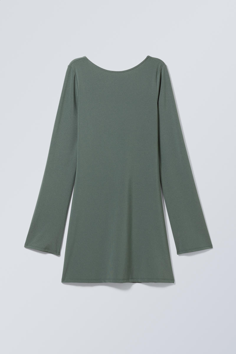 En go-to miniklänning tillverkad av en mjuk och flexibel polyester och återvunnet polyester-tyg, förstärkt med en touch av elastan. Denna go-to piece har båthals och öppen rygg, långa ärmar, normal passform med en lätt A-linjeformad kjol och faller vid låret.