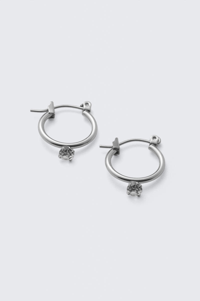 Ett par ringlika örhängen prydda med diamantformade stenar. De är cirka 11 mm höga (utan stenen), är tillverkade av återvunnen mässing och har gångjärns-stängning.