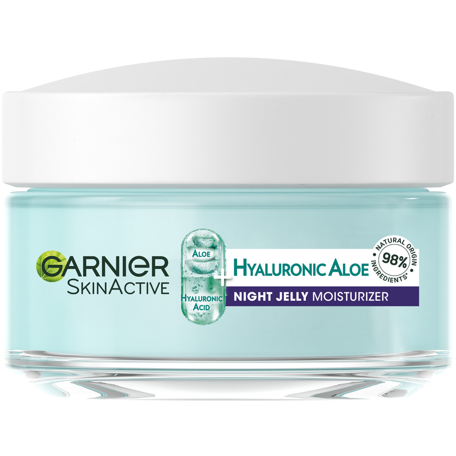 Intensiv återfuktning för natten med aloe vera och hyaluronsyra Garnier SkinActive Hyaluronic Aloe Night gel är en återfuktande ansiktskräm för natten som ger huden intensiv fukt i 48 timmar. Denna aloe vera ansiktskräm med hyaluronsyra kan användas både som klassisk nattkräm och som nattmask för alla hudtyper. Fördelarna med denna aloe vera nattkräm Ger intensiv återfuktning i upp till 48 timmar Innehåller ekologisk aloe vera och hyaluronsyra Två användningsmöjligheter – som nattkräm eller nattmask Vegansk formula som passar alla hudtyper Så här använder du Garnier SkinActive Hyaluronic Aloe Night Applicera som sista steget i din kvällsrutin för omedelbar fukt, eller använd som nattmask genom att applicera ett tjockt lager innan sänggående. En pålitlig lösning för dina dagliga återfuktningsbehov. Lägg till Garnier SkinActive Hyaluronic Aloe Night i din hudvårdsrutin redan idag!