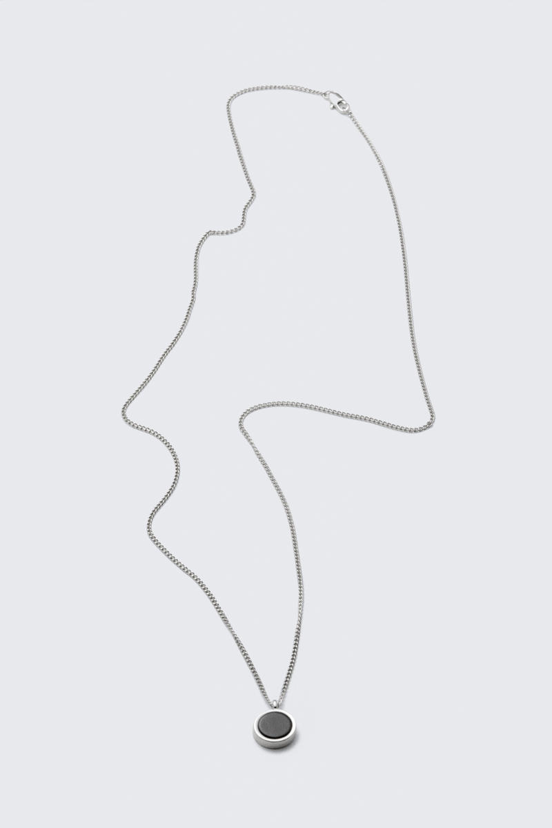 Ett 60 cm långt kedjehalsband med hummerstängning. Halsbandet har ett runt tigerögonhänge. Hänget mäter 11 mm i diameter.