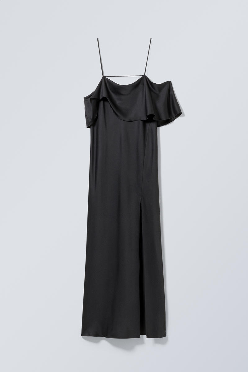 En lång, draperad off-shoulder klänning i mjuk twill av återvunnen polyester-satin. Den har ett korslagt band fram som går över till axelband som knyts i ryggen, off shoulder-drapering på ena sidan och en söm mitt bak. Hög slits med rullad, sydd nederkant.