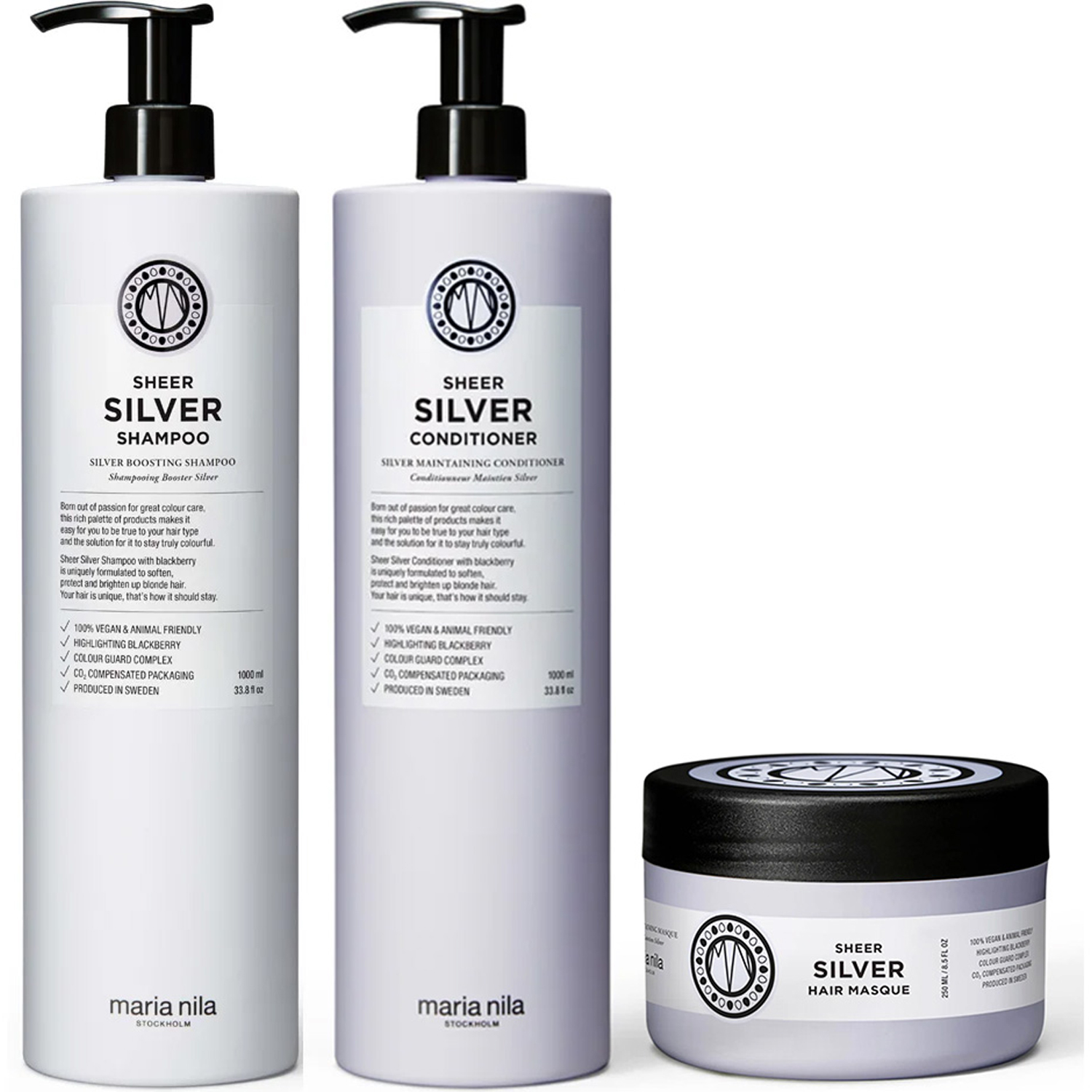 Komplett hårvård för vackert silver och grått hår Maria Nila Sheer Silver Trio erbjuder en komplett hårvårdsrutin speciellt utvecklad för silver, grått och blekt hår. Detta generösa set innehåller shampoo och conditioner i storformat om 1000ml vardera samt en intensiv hårmask på 250ml – perfekt för att neutralisera gula toner och förstärka hårets naturliga silvernyans. Den professionella formuleringen vårdar och skyddar samtidigt som den ger hållbar färgbalans och lyster. Fördelarna med Maria Nila Sheer Silver Trio Komplett hårvårdsset med shampoo, conditioner och mask för silver och grått hår Neutraliserar effektivt gula toner och förstärker silvernyansen Storformat som räcker längre – 1000ml shampoo och conditioner Vegan och djurvänlig formula producerad i Sverige Perfekt för dig som vill ha en komplett och effektiv hårvårdsrutin för silver och grått hår. Upptäck Maria Nila Sheer Silver Trio redan idag!
