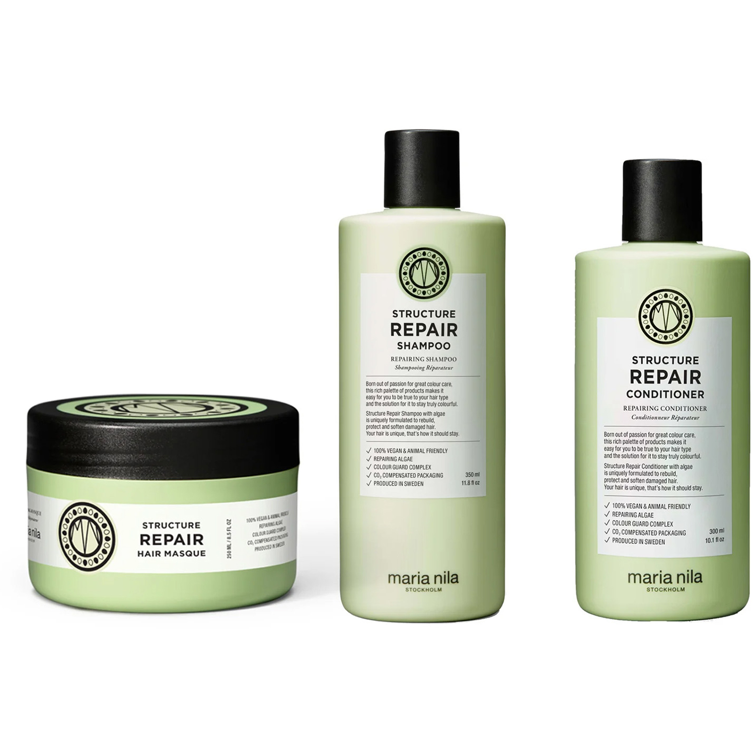 Komplett hårvårdsritual för skadade och torra hår Maria Nila Structure Repair Trio är den perfekta lösningen för dig som vill återställa ditt skadade, torra eller kemiskt behandlade hår. Detta kompletterande set med schampo, balsam och hårinpackning arbetar tillsammans för att ge ditt hår tillbaka dess naturliga styrka, mjukhet och glans. Reparerande algextrakt bygger upp hårets struktur medan Colour Guard Complex skyddar mot färgförlust och UV-strålning – en revolutionerande kombination inom hårvård som verkligen gör skillnad. Varför du kommer älska detta hårvårdstrio Komplett system som reparerar och stärker skadade hår från rot till topp Reparerande algextrakt återställer hårets naturliga styrka och elasticitet Colour Guard Complex skyddar färgat hår mot blekning och UV-skador Sulfat- och parabenfri formula som är skonsam mot känslig hårbotten Perfekt för alla som vill ge sitt slitna hår den vård det förtjänar. Upptäck Maria Nila Structure Repair Trio och upplev skillnaden redan nu!