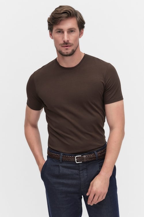 T-shirten har rund halsringning och en passform som funkar lika bra att bära som den är, som under en kavaj. Ett användbart plagg i flera färger – och den finns även som v-ringad variant.