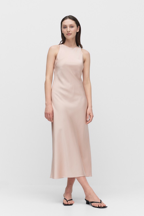 Gzceri dress från Gestuz är en minimalistisk klänning i en mjukt glänsande satinfinish. Klänningen har ärmlös design med hög, rundad halsringning och en smickrande A-linjeform. Den stilrena siluetten och det svala tyget gör den lika perfekt för festliga tillfällen som för en uppklädd vardagslook. Stängs med en dragkedja baktill.