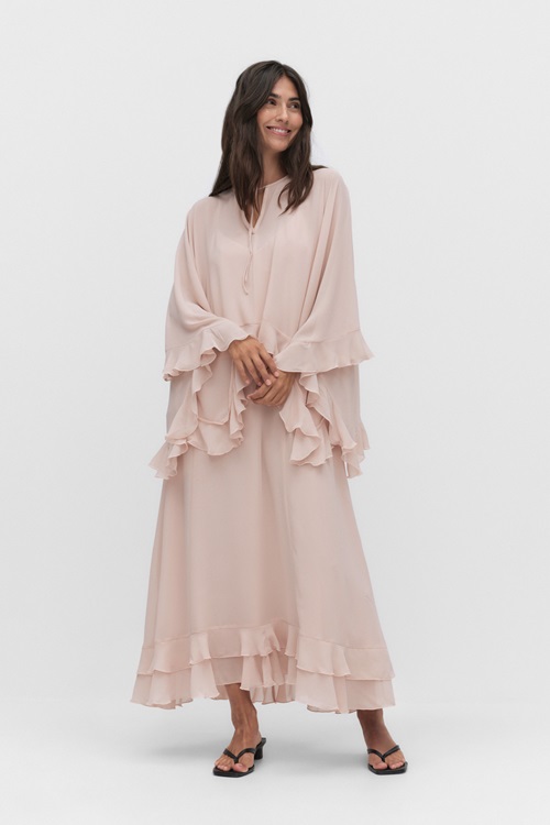 Adelyniw dress från InWear är en luftig och feminin klänning i en avslappnad siluett med en tillhörande voluminös cape och subtila volangdetaljer. Modellen har en lätt v-ringad halsringning med knytband. Perfekt för varma dagar och sommarens fester.