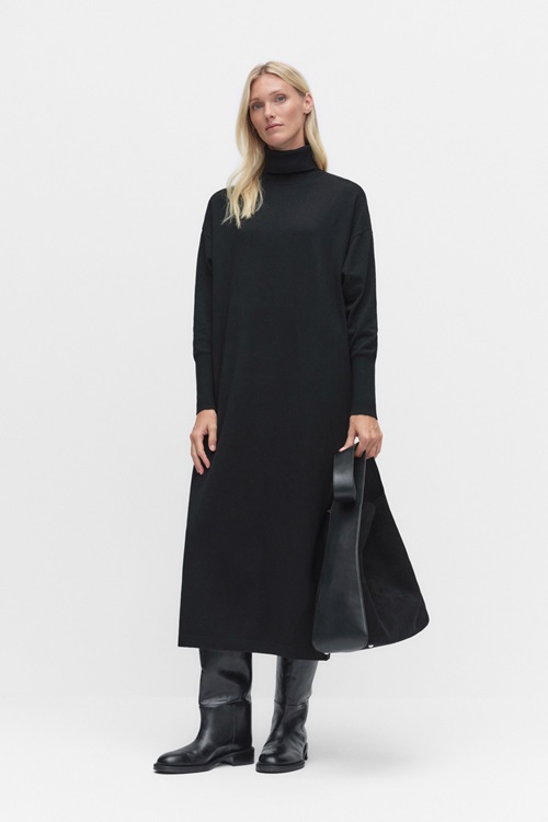 Kellsieiw är en långärmad klänning i mjuk, finstickad kvalitet med en rak och avslappnad passform. Klänningen har polokrage och ribbade muddar för en enkel och klassisk look. Den helsvarta färgen ger en tidlös känsla och gör plagget lätt att matcha både för vardag och mer dressade tillfällen. Perfekt att bära med stövlar eller sneakers beroende på stil och säsong.
