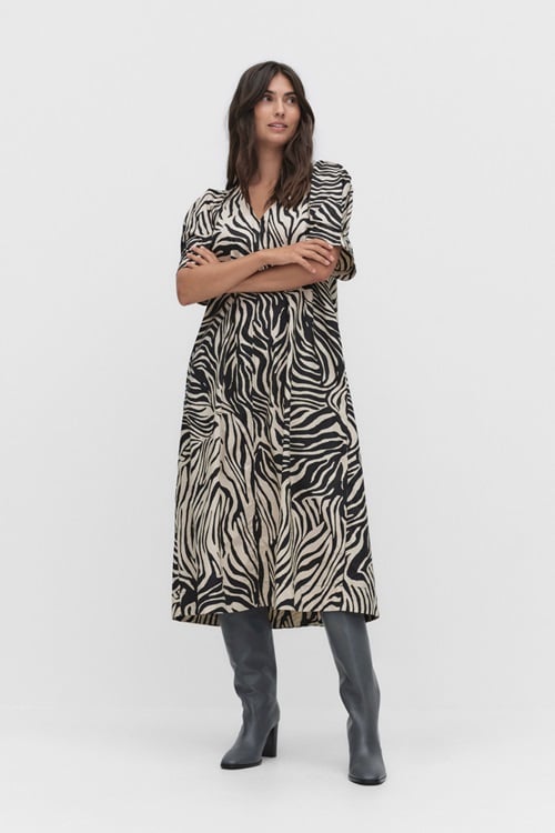 Pranni Dress från Second Female är en klänning med djurinspirerat mönster som ger en trendig look. Modellen har en avslappnad passform med v-ringning, kort ärm och lätt utsvängd siluett som skapar ett fint fall. Tillverkad i ett mjukt och följsamt material som gör den bekväm att bära hela dagen – oavsett om du klär upp den med klackar eller bär den mer avslappnat med sneakers.