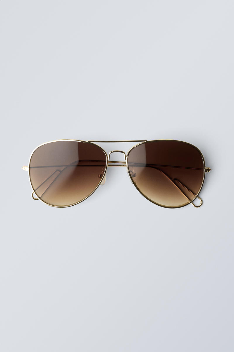 Ett par stora pilotsolglasögon i unisexstil med mörka linser och en tunn båge tillverkad av mässing.