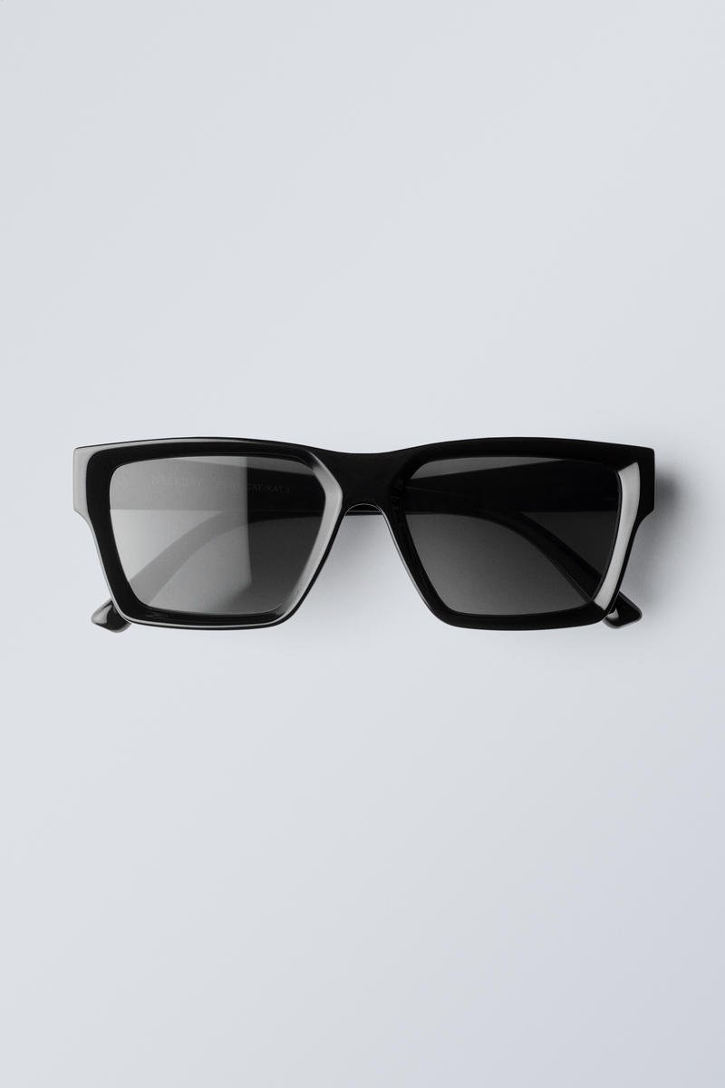 Ett par fyrkantiga, unisex solglasögon med tjock båge och stilren design.