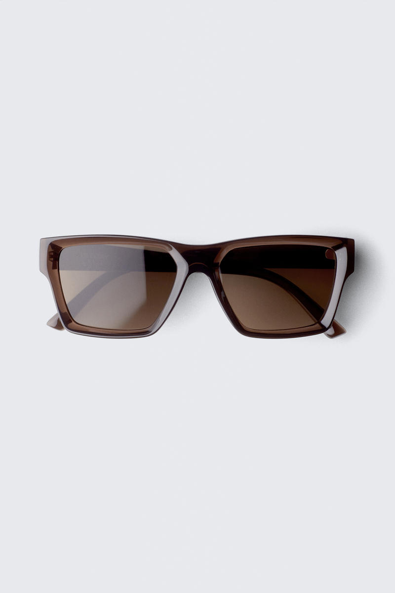Ett par fyrkantiga, unisex solglasögon med tjock båge och stilren design.