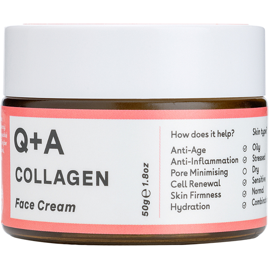 Återfuktande ansiktskräm med kollagen för smidigare hud Q+A Collagen Face Cream är en praktisk ansiktskräm som återfuktar och gör huden smidigare med hjälp av naturligt kollagen från tång. Formeln innehåller närande sheasmör och Magnesium PCA som ger huden återfuktning och en frisk känsla, perfekt för daglig användning. Fördelarna med denna ansiktskräm Innehåller naturligt kollagen från tång som gör huden mer elastisk Magnesium PCA ger återfuktning och får huden att kännas stark Sheasmör näringar huden på djupet, även torr hud 98,5% naturliga ingredienser, vegetarisk och parfymfri Så här använder du Q+A Collagen Face Cream Applicera ett jämnt lager på ren hud och kan användas som både dag- och nattkräm. En pålitlig lösning för din dagliga hudvård. Lägg till Q+A Collagen Face Cream i dina essentials.