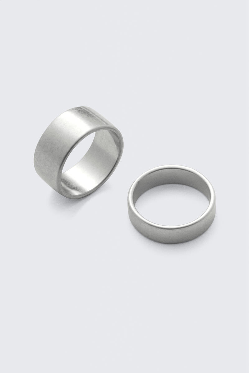 Ett set med två klassiska ringar tillverkade i blankpolerad, återvunnen zink. En ring är något bredare än den andra.