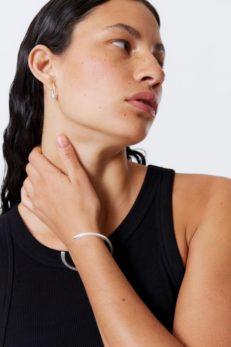 A minimal bangle with subtle texture and a softly brushed finish. Crafted from recycled brass with silver-plating, it features an open cuff design and square-cut edges for a clean, sculptural look. A timeless piece to stack or style solo.