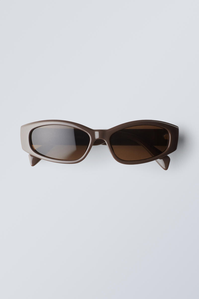 Ett par stickade ut stora, unisexformade solglasögon med mörka glas.