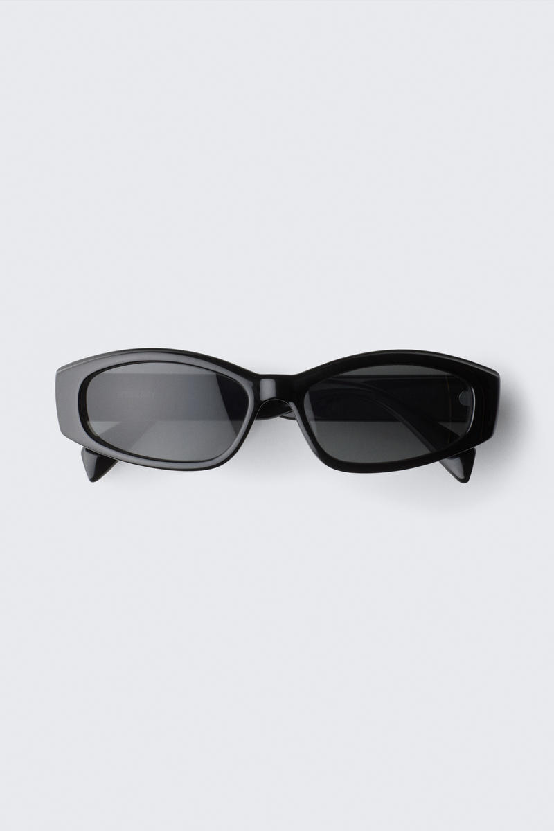 Ett par stickade ut stora, unisexformade solglasögon med mörka glas.