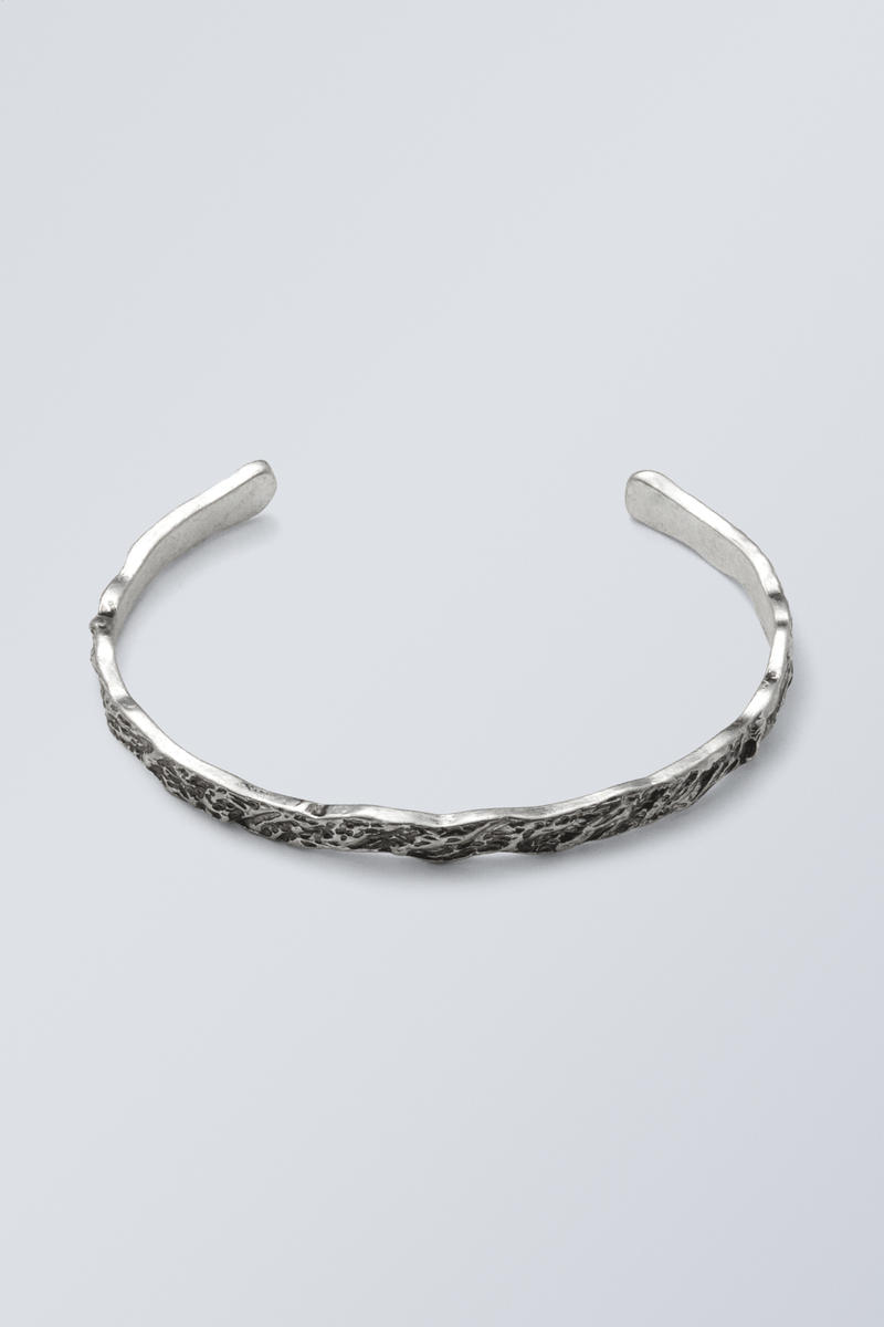 A textured bangle bracelet crafted from recycled zinc with a burnished silver finish. Featuring a rugged, uneven surface for a textured and smashed look.