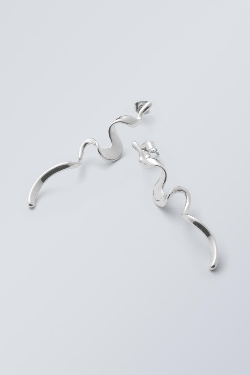 Ett par spiralörhängen som mäter 6 cm i total höjd tillverkade av återvunnen zink med fjärilsnålar.