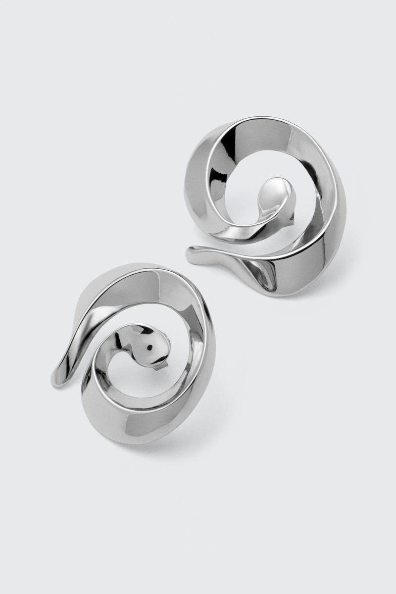 A pair of swirly pin-earrings crafted from recycled zinc.